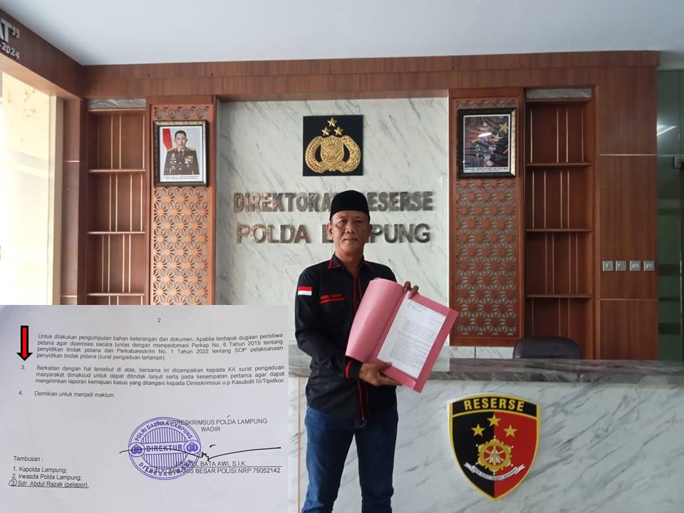 Bandar Lampung, basmitipikor.com – Ketua LSM BASMI (Barisan Muda Indonesia ) Lampung Tengah, Abdul Razak, menyampaikan kekecewaannya atas tidak jelasnya tindak lanjut laporan dugaan tindak pidana korupsi yang telah mereka layangkan ke Polda Lampung sejak 19 Februari 2025 lalu. Laporan tersebut teregistrasi dengan nomor: B/596/II/2025/Res.3./reskrimsus.