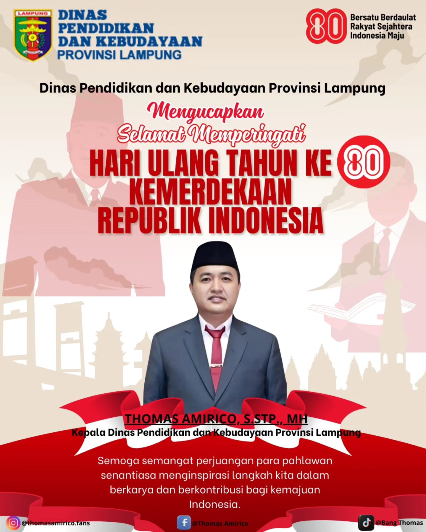 Bandar Lampung,basmitipikor.com – Dalam momentum peringatan Hari Ulang Tahun (HUT) Kemerdekaan Republik Indonesia yang ke-80, Kepala Dinas Pendidikan Provinsi Lampung, Thomas Amirico, menyampaikan ucapan selamat serta ajakan untuk terus memperkuat persatuan dan meningkatkan kualitas pendidikan demi kemajuan bangsa.